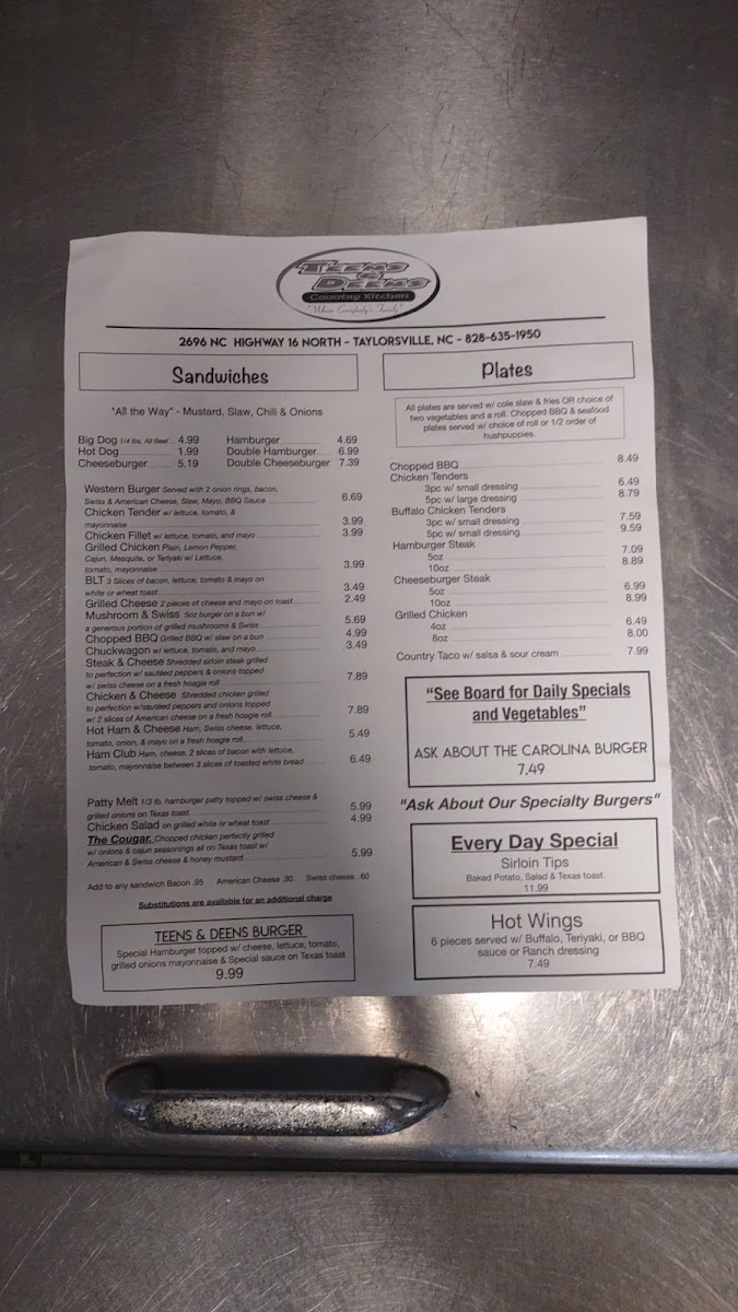 Welcome to Teens & Deens Country Kitchen, a delightful gem located in the heart of Taylorsville, NC. This family-owned eatery brings the warmth of homestyle cooking to your table. The menu is a treasure trove of comfort food, featuring hearty sandwiches that include mouthwatering options like the hand-patted burgers and the famed Hillbilly Nachos, a local favorite.